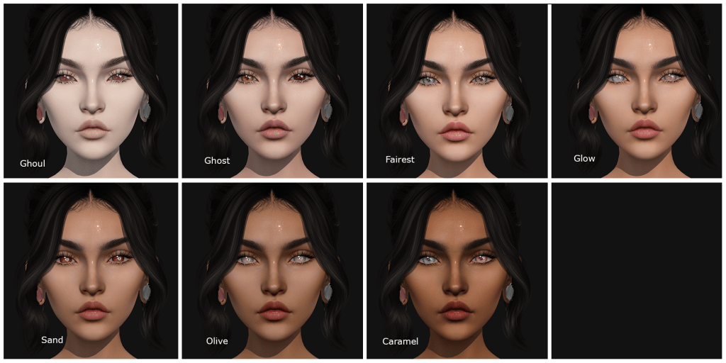 Maud is available in the seven tones shown below, and being shown on the beautiful Vivian head from Lelutka that is also available at the Skin fair at a 25% discount. Maud has Ginger, Blonde, Brown and Black eyebrow options (black shown below) along with a no eyebrow option so that you can add your favourite! She’s got a BUNCH of add ons, including nose contour, blush, liner and alternate lips for Siwa and Ubon (which i used on the main picture above), and between you and me she’s my current favourite skin and you’ll be seeing her with a tweaked shape over the next couple of blog posts!